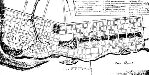 Як вже відзначалося, протягом першої половини XIX ст. розбудова Катеринослава йшла повільно. Згідно з описом міста 1797 р., тут було лише 11 кам'яних споруд. Після відомого указу Павла І (1797 р.) кам'яне будівництво взагалі не велося. У 1808 р. губернатор Катеринослава у донесенні імператорові вказував на катастрофічну ситуацію з будівництвом "присутственных мест" та соборної церкви. Головною спорудою міста на той час був Потьомкінський палац, який зводився за проектом І.Старова та закінчений 1792 р., вже після смерті власника. Палац та сад при ньому (заснований запорозьким козаком Лазарем Глобою та перетворений на парк англійським садівником В.Гульдом) знаходилися в запустінні. Від палацу збереглися лише стіни, а все інше було зруйноване. У записках Ф.Ф.Вігеля ми знаходимо цікавий опис міста, куди автор приїхав у 1827 р.: "Во всем губернском городе не было ни одной гостиницы, а какой-то заезжий двор, куда меня привезли, и где не знаю чем бы я мог прокормиться. Широкая площадь... спускалась с высокой горы и в прямом направлений тянулась через весь город внизу; по бокам все были низкие домики. Единственное каменное здание во всем Екатеринославе был острог...На вершине горы под именем площади находится пространное пустое поле; с трудом мог я разглядеть на нем нечто выходящее из земли: то бнли выведенные 3 или 4 фута27 кирпичных стен собора... В расстоянии четверги версты оттуда находился Потемкинский дворец... Все это было без полов, без окон, без дверей, и дождь капал сверху сквозь дырявую деревянную крышу..." Особливістю розвитку Катеринослава у першій половині XIX століття була наявність двох міських центрів. Цей факт спричинений різницею між проектами та реальними умовами будівництва. Перший міський центр мав розташуватися на горі, але він існував переважно на папері - у проектах І.Старова та на пізнішому плані роботи В.Гесте. Тут знаходилися лише декілька споруд: палац Потьомкіна, канцелярія архієрея, а пізніше (у 1840-1850-х рр.) побудовано гімназію та "богоугодные заведения" (лікарню, притулок для інвалідів, аптеку). Натомість у нижній, придніпровській частині Катеринослава природно виник справжній міський центр. Тут зосередилося все економічне та громадське життя міста. Головна височина з Потьомкінським палацом залишалася незаселеною, натомість квартали прибережної зони забудовувалися дуже щільно. У 1796 р. тут був споруджений перший наплавний міст через Дніпро. У 9 квітня 1817 р. був офіційно затверджений генеральний план розвитку Катеринослава, розроблений архітектором В.Гесте, з використанням первісного планування міста 1790-х років архітектора І.Старова. На новому плані центр Катеринослава перенесений у нижню частину біля Дніпра. Колишня головна площа на горі тепер отримала назву Ярмаркової28. У новому центрі виділено низку площ господарського значення - Торгова, Сінна, Рибна. Згідно з цим планом аж до кінця XIX ст. і велася забудова Катеринослава.